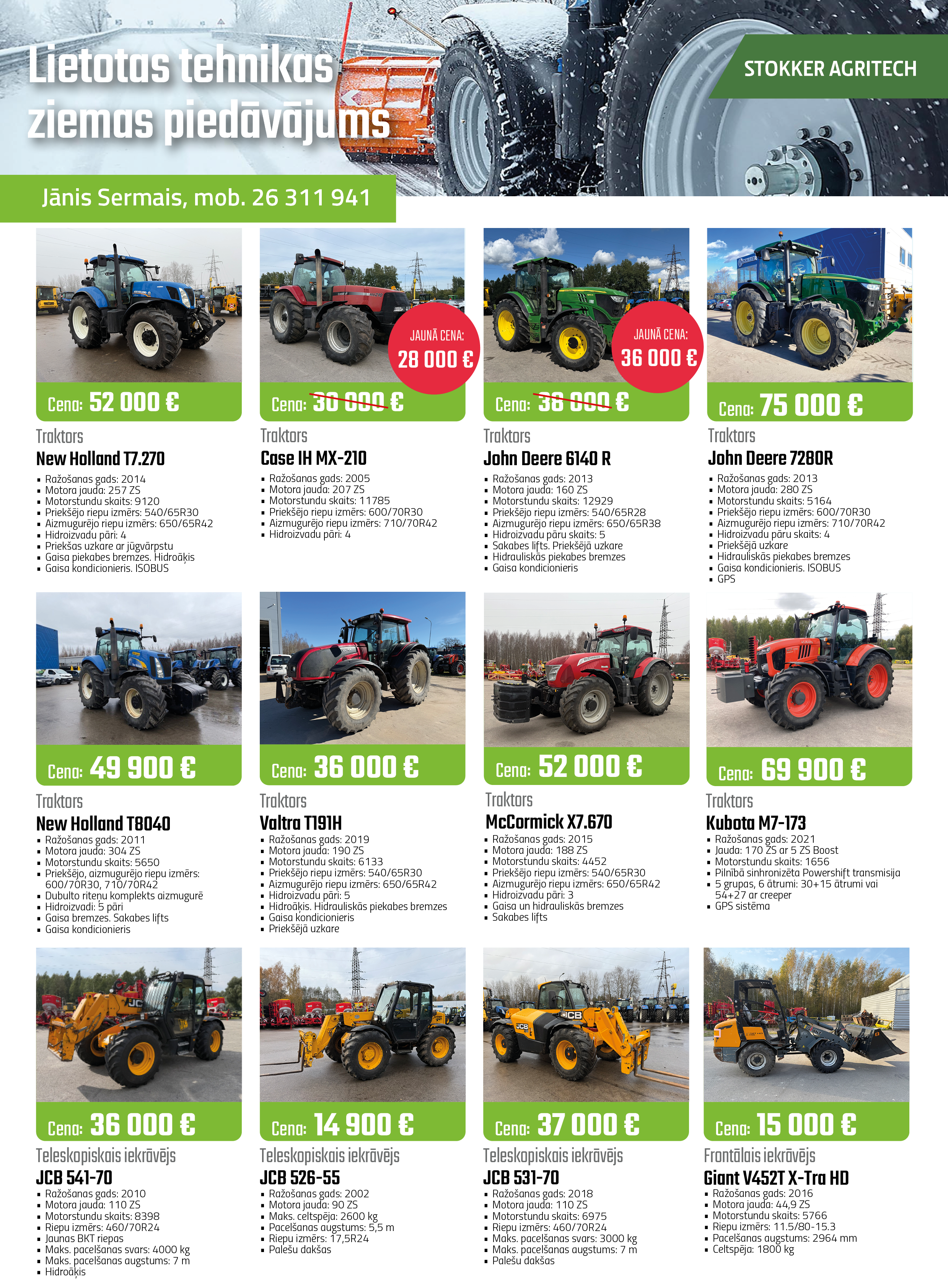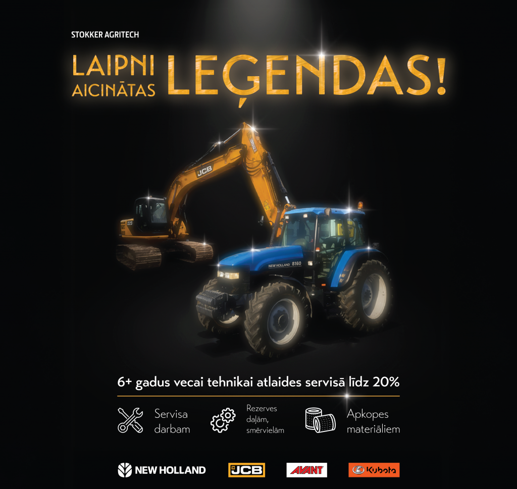 Visās Stokker Agritech servisa filiālēs īpašais piedāvājums NEW HOLLAND, JCB, AVANT, KUBOTA zīmolu lauksaimniecības, celtniecības un komunālajai tehnikai, kas vecāka par 6 gadiem: