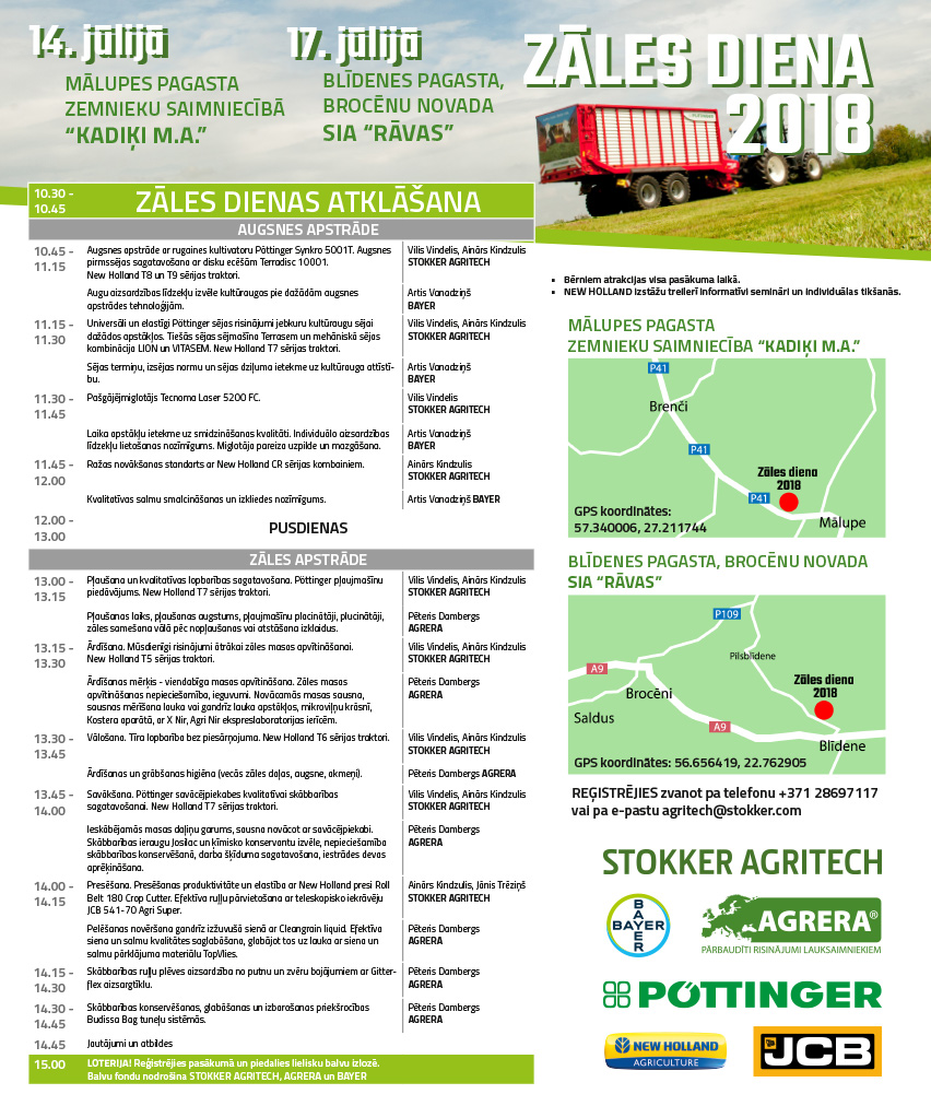 STOKKER AGRITECH sadarbībā ar Agrega un Bayer ielūdz uz Zāles dienām 2018! Pirmais pasākums notiks Vidzemē, Mālupes pagasta zemnieku saimniecībā “KADIĶI M.A.” 14.jūlijā, savukārt Kurzemes pusē 17.jūlijā gaidīsim visus interesentus SIA “RĀVAS” saimniecībā Blīdenes pagastā, Brocēnu novadā. Šī būs lieliska iespēja vienkopus apskatīt, saņemt speciālistu konsultācijas un redzēt darbībā Pöttinger augsnes un zāles apstrādes tehniku, kā arī izvēlēties agregātam piemērotāko un jaudas ziņā atbilstošu New Holland traktoru. Pöttinger tehnika būs apskatāma sākot ar rugaines kultivatoru, diskiem, sējmašīnām, pļaujmašīnām, ārdītājiem, grābekļiem, visbeidzot ar savācējpiekabi. New Holland traktoru modeļu būs apskatāmi no T5, T6, T7, T8 un T9 sērijām, kā arī rādīsim un stāstīsim par New Holland CR sērijas kombainu priekšrocībām. Lielisks palīgs saimniecībā būs JCB teleskopiskais iekrāvējs gan graudu iekraušanas/izkraušanas darbos, gan ķīpu pārvietošanā tas būs krietni izveicīgāks un ātrāks kā riteņu traktors. Mūsu mērķis Jums paradīt plašu tehnikas augsnes un zāles apstrādei, ražas novākšanai, miglošanai, sniegt padomu, kā izvēlēties atbilstošu tehniku un stāstīt par tehnoloģijām, kas ļaus paveikt darbus ātrāk, efektīvāk un izmaksu ziņā ekonomiskāk!