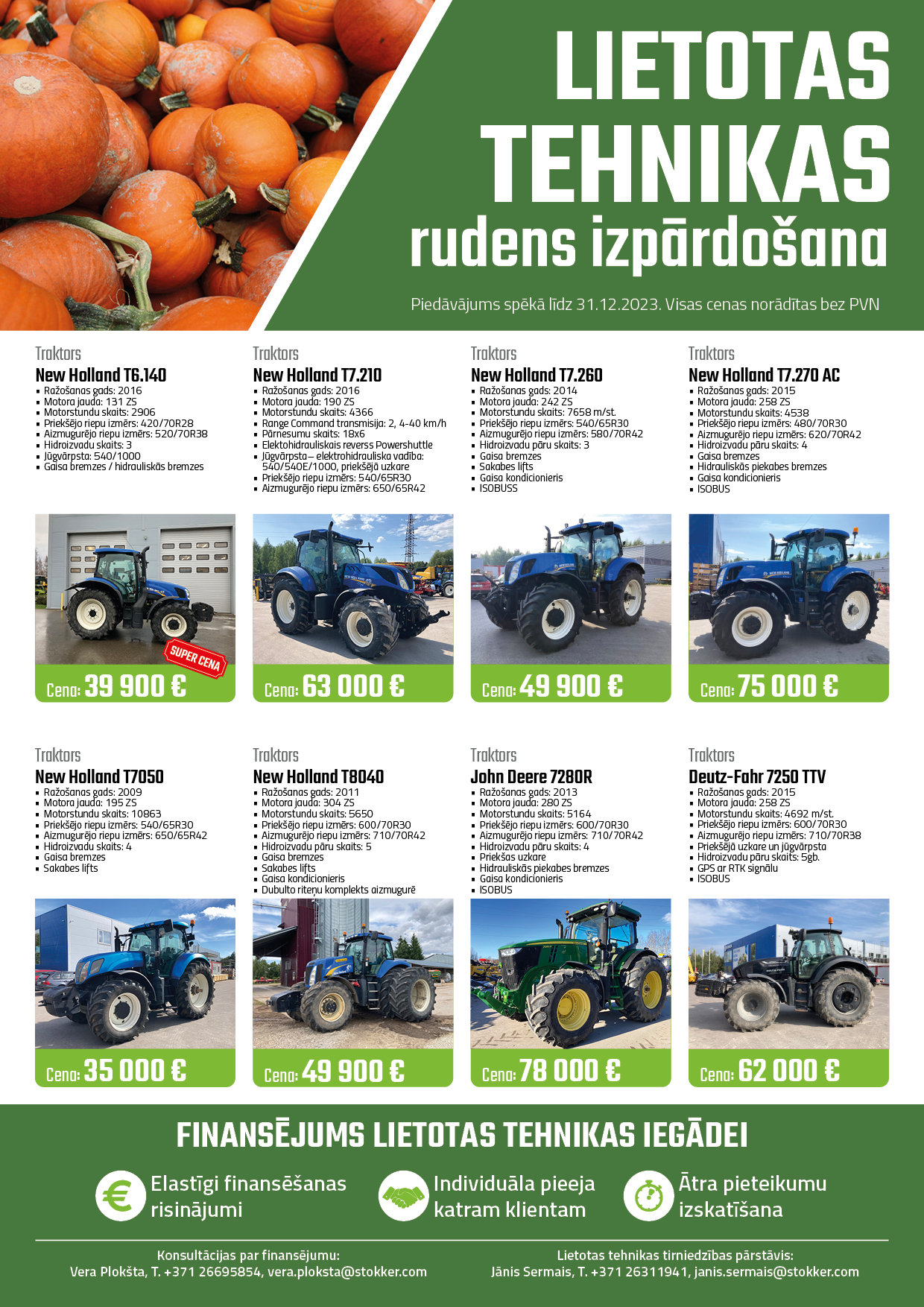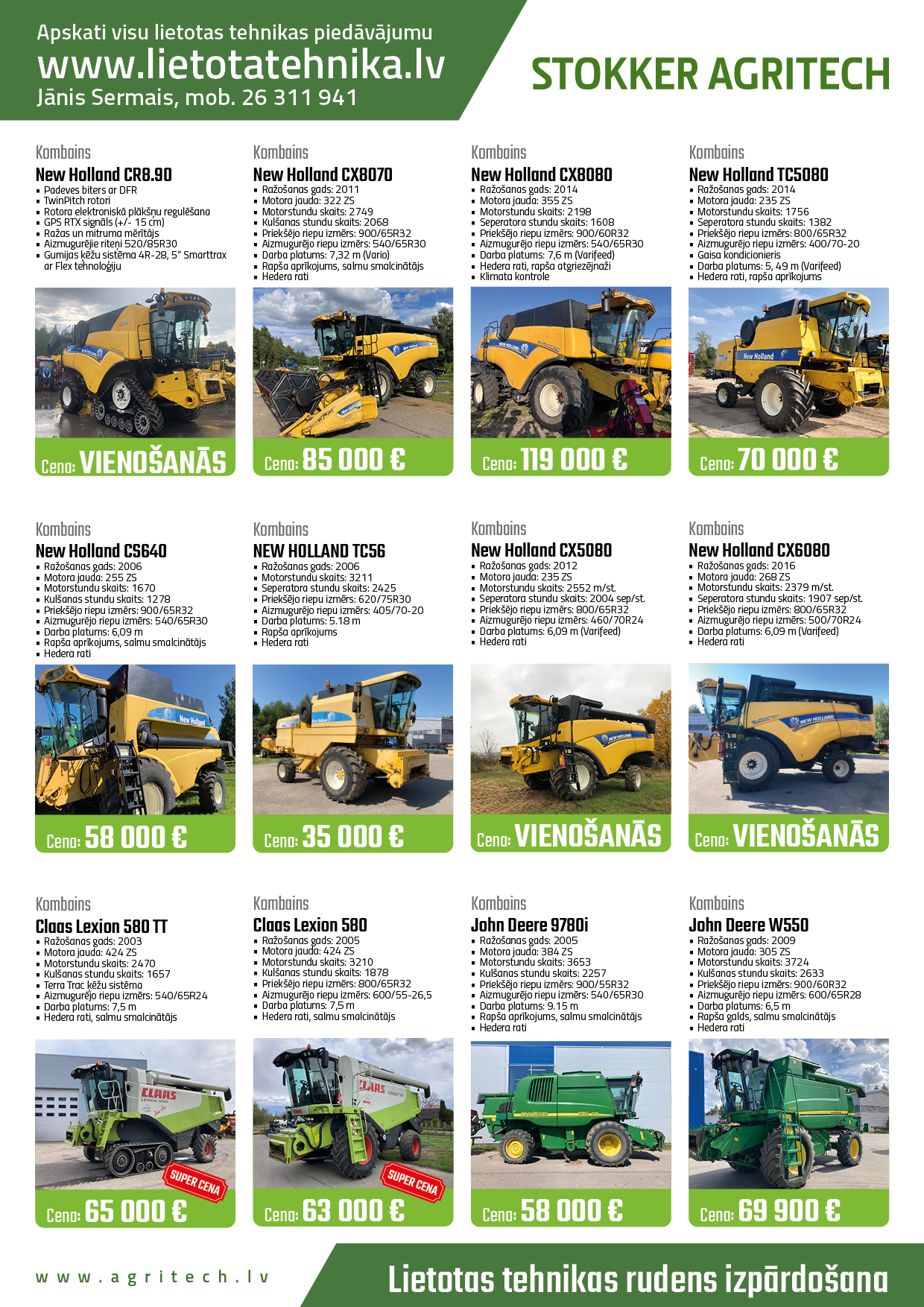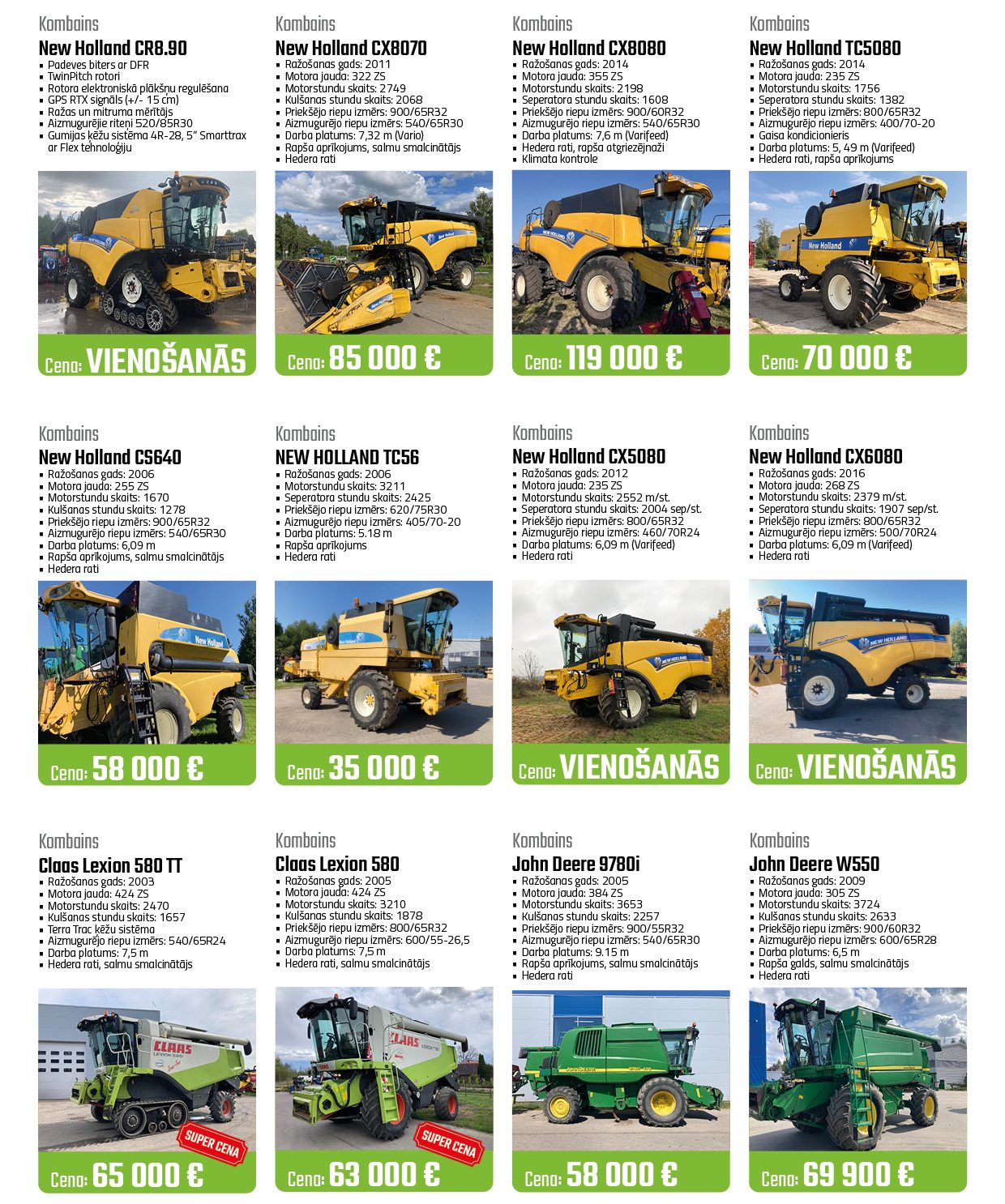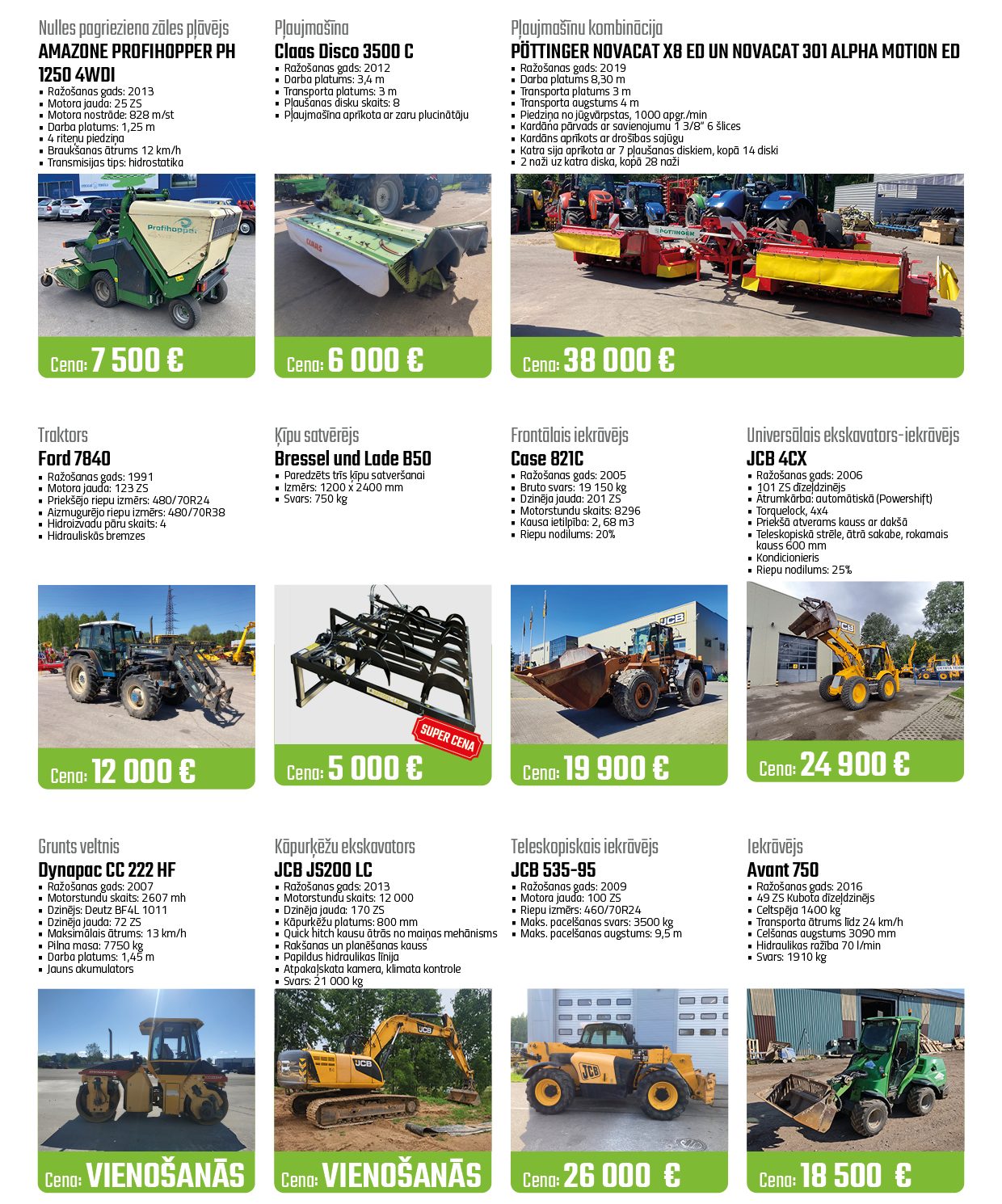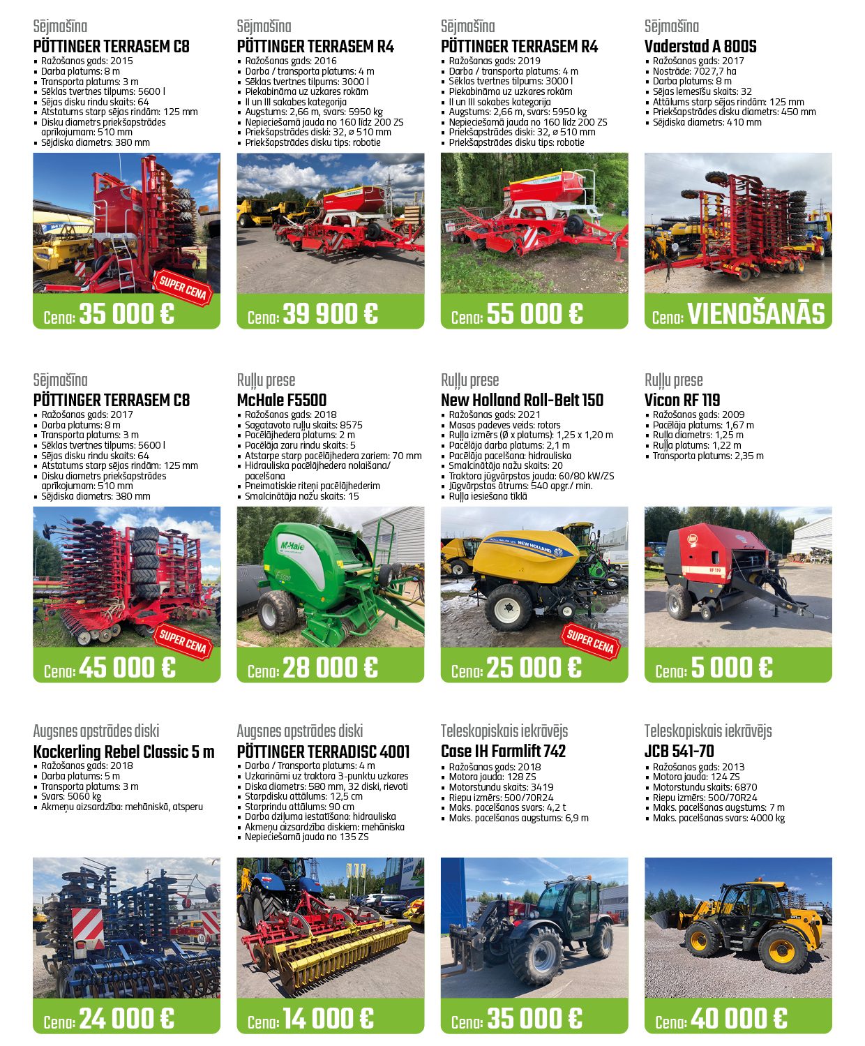 - Plašākā lietotas lauksaimniecības tehnikas izvēle vienuviet – dažādu ražotāju traktori, kombaini, sējmašīnas, augsnes apstrādes diski, ruļļu preses, pļaujmašīnas un teleskopiskie iekrāvēji.