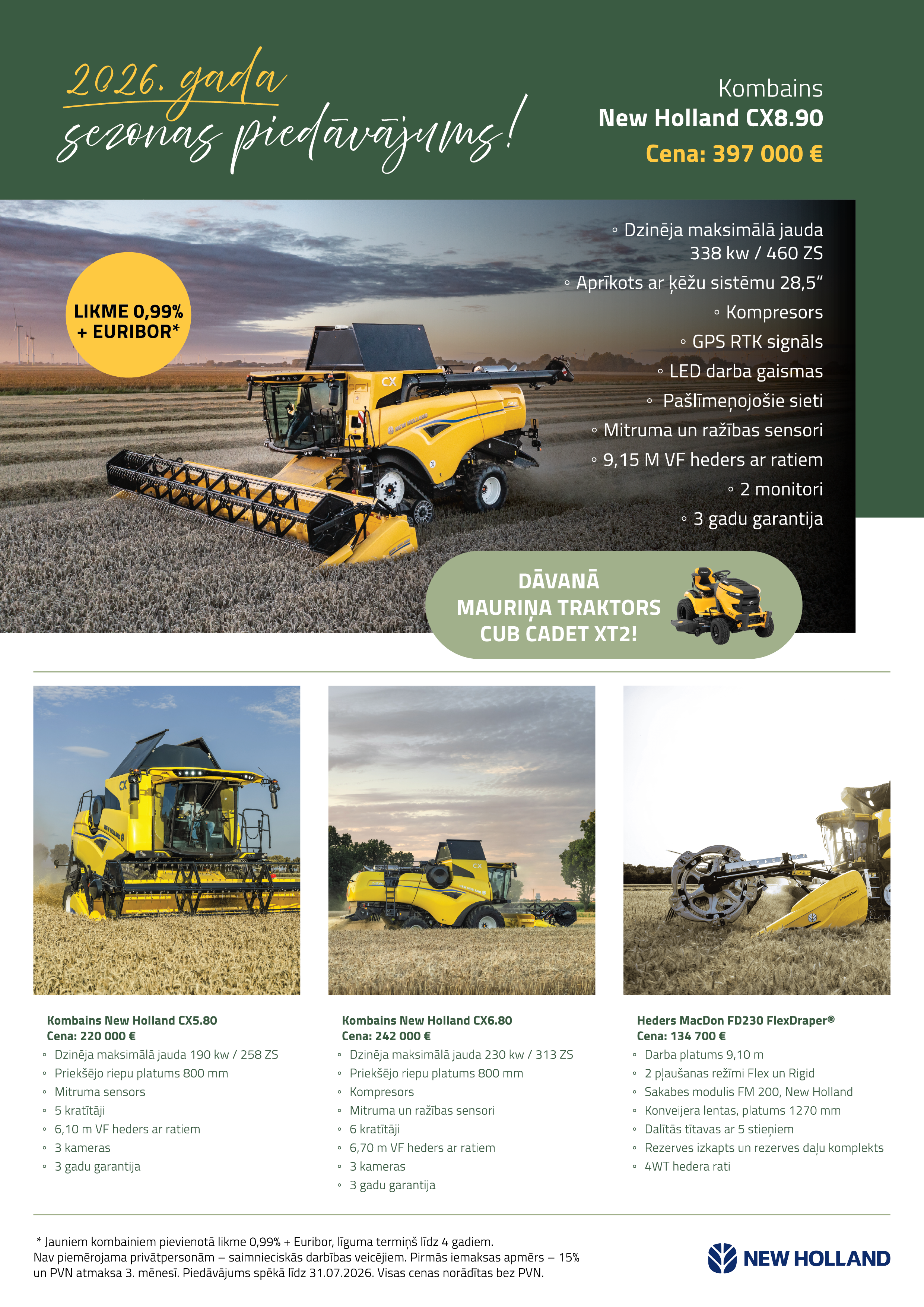 - Visiem jauniem New Holland kombainiem pievienotā likme 0,99% + Euribor, termiņš līdz 4 gadiem