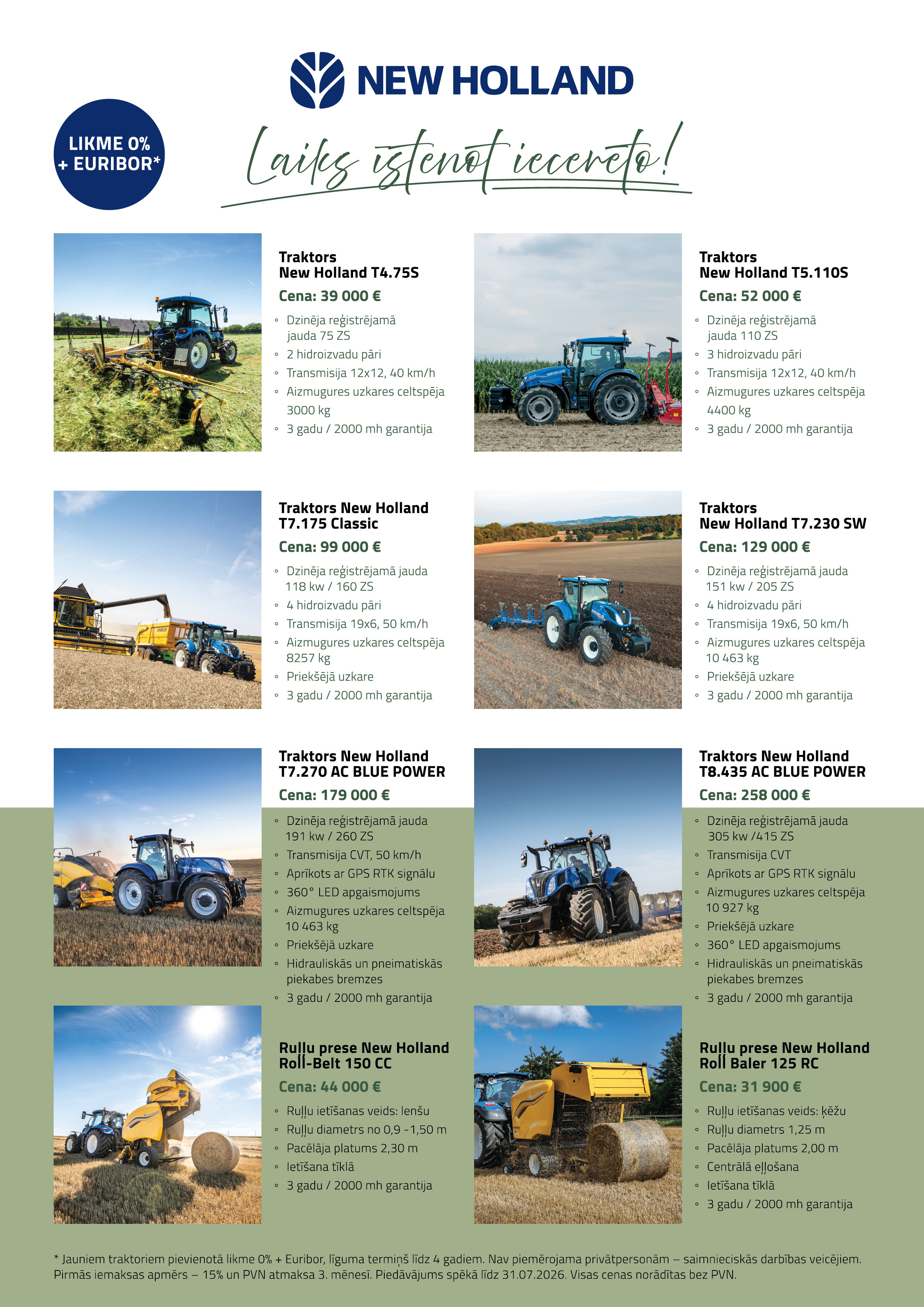 - Visiem jauniem New Holland traktoriem pievienotā likme 0,99% + Euribor, termiņš līdz 4 gadiem