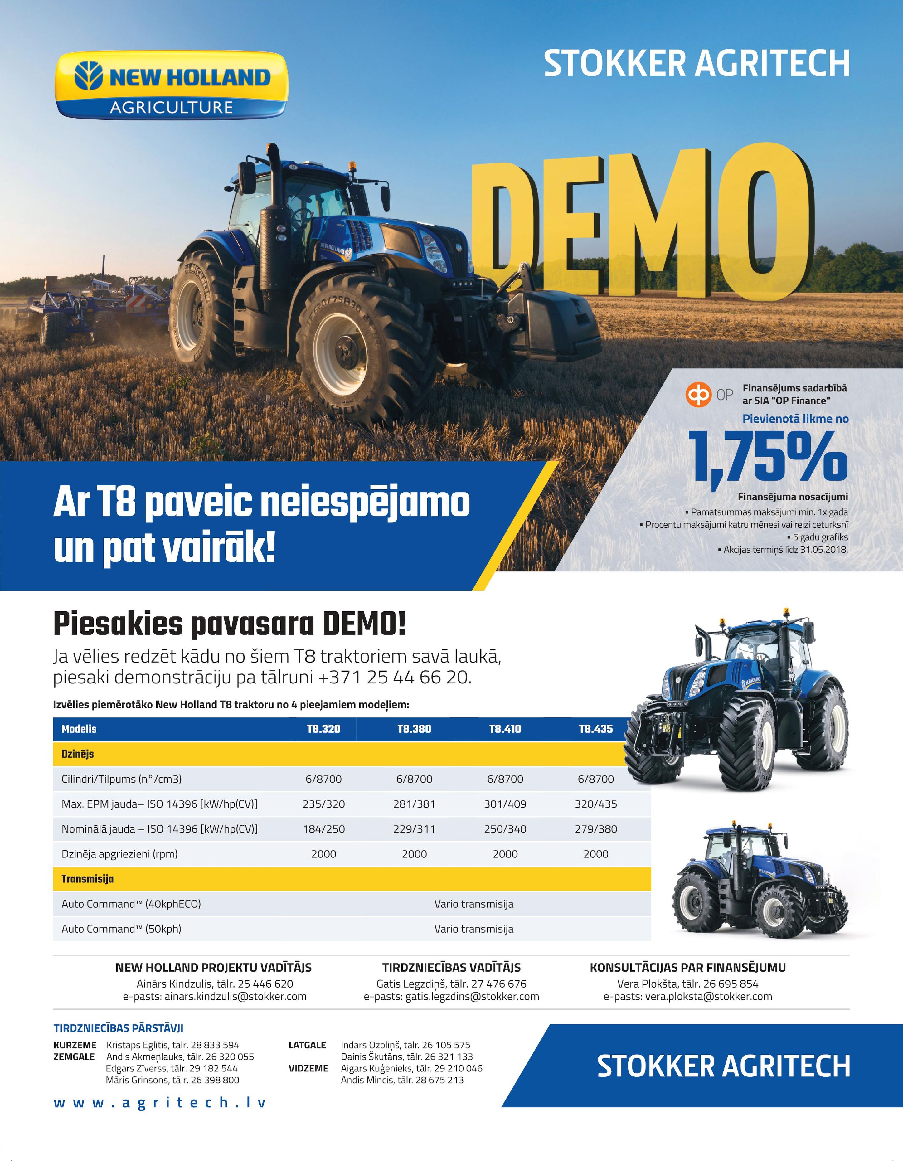 Ja vēlies redzēt kādu no četriem pieejamiem T8 traktora modeļiem (T8.320, T8.380, T8.410, T8.435) savā laukā, piesaki demonstrāciju pa tālruni +371 25446620.