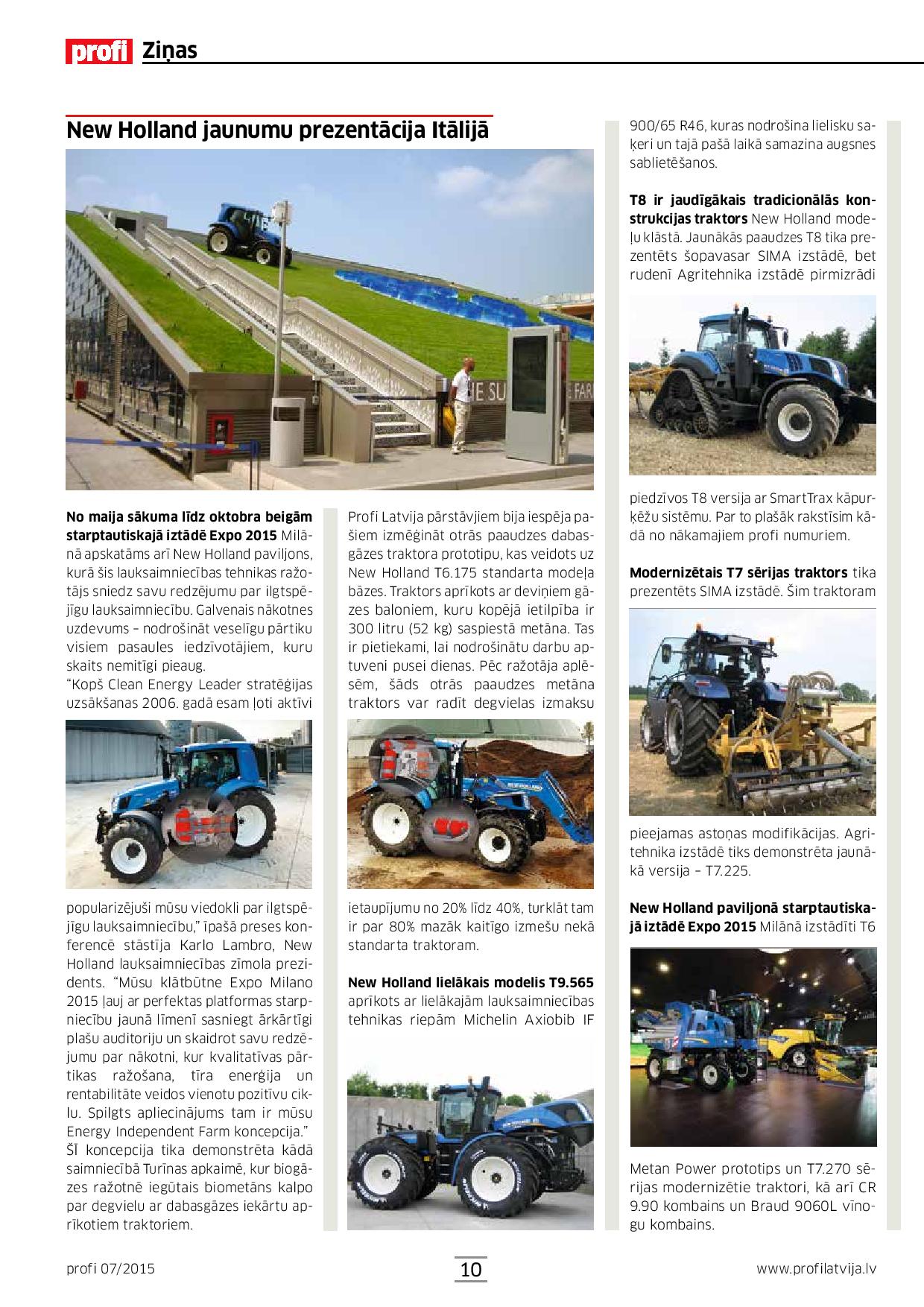 No maija sākuma līdz oktobra beigām starptautiskajā izstādē Expo 2015 Milānā apskatāms arī New Holland paviljons, kurā šis lauksaimniecības tehnikas ražotājs sniedz savu redzējumu par ilgtspējīgu lauksaimniecību. Profi Latvija pārstāvjiem bija iespēja pašiem izmēģināt otrās paaudzes dabasgāzes traktora prototipu, kas veidots uz New Holland T6.175 standarta modeļa bāzes. Klikšķini uz foto un vairāk lasi Profi rakstā!