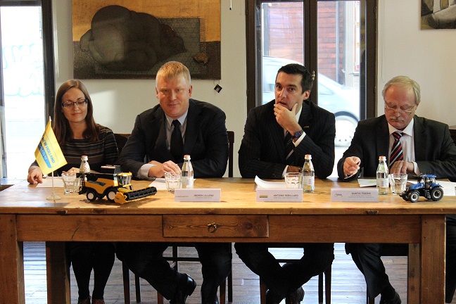 Preses konference par jauno sadarbību. No kreisās: STOKKER sabiedrisko attiecību speciāliste Elīna Neimane, SIA AGRITECH valdes loceklis Indrek Lillend, NEW HOLLAND AGRICULTURE pārstāvis Antoine Rebillard, Lauksaimniecības tehnikas ražotāju un tirgotāju asociācijas valdes loceklis Guntis Tīģeris.